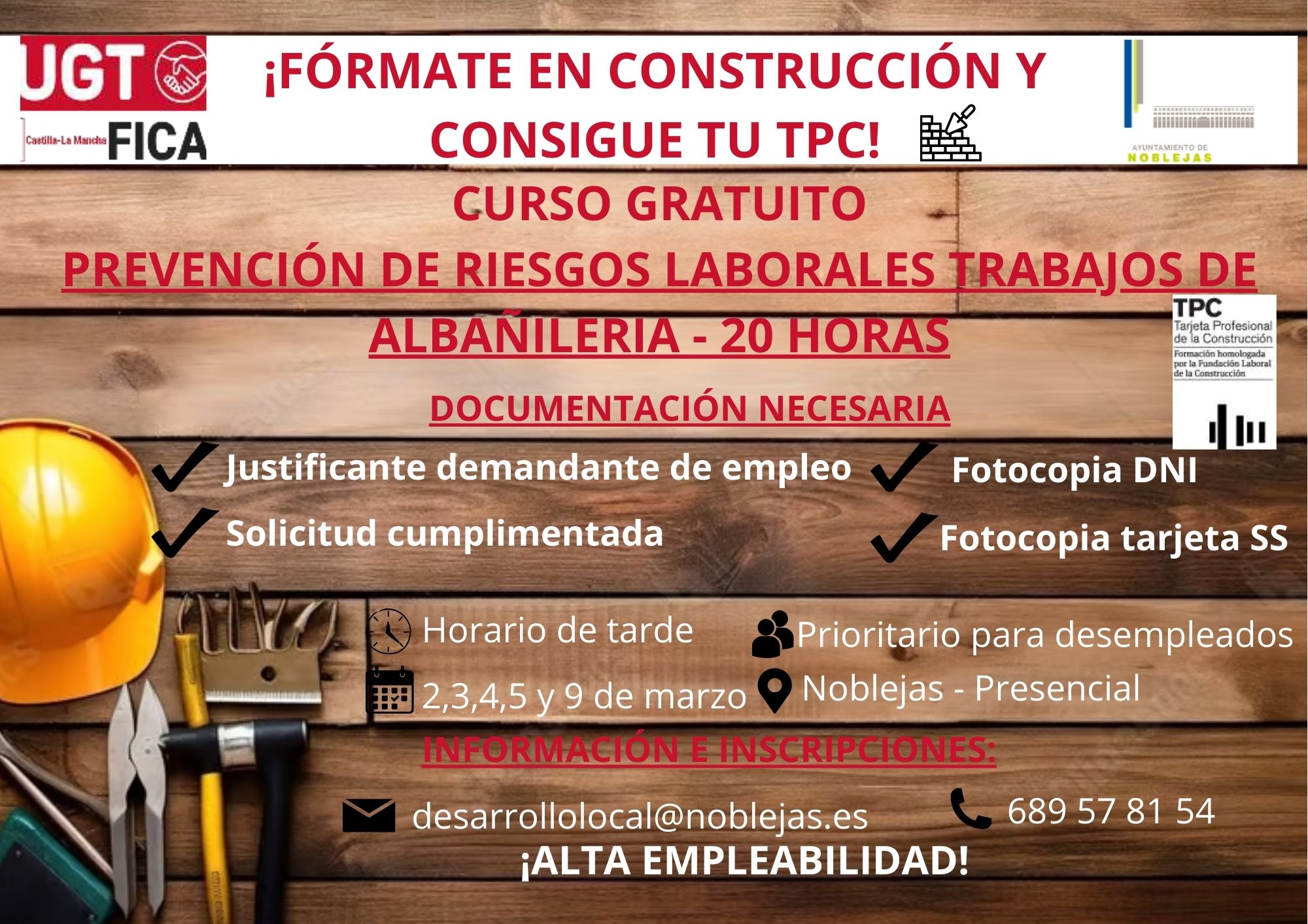 Si buscas trabajo y te interesa el sector de la construcción, el área de Empleo y Desarrollo Local de Noblejas, en colaboración con UGT FICA y la Fundación Laboral de la Construcción,  te ofrece un curso gratuito de 20 horas en Prevención de Riesgos Laborales.
